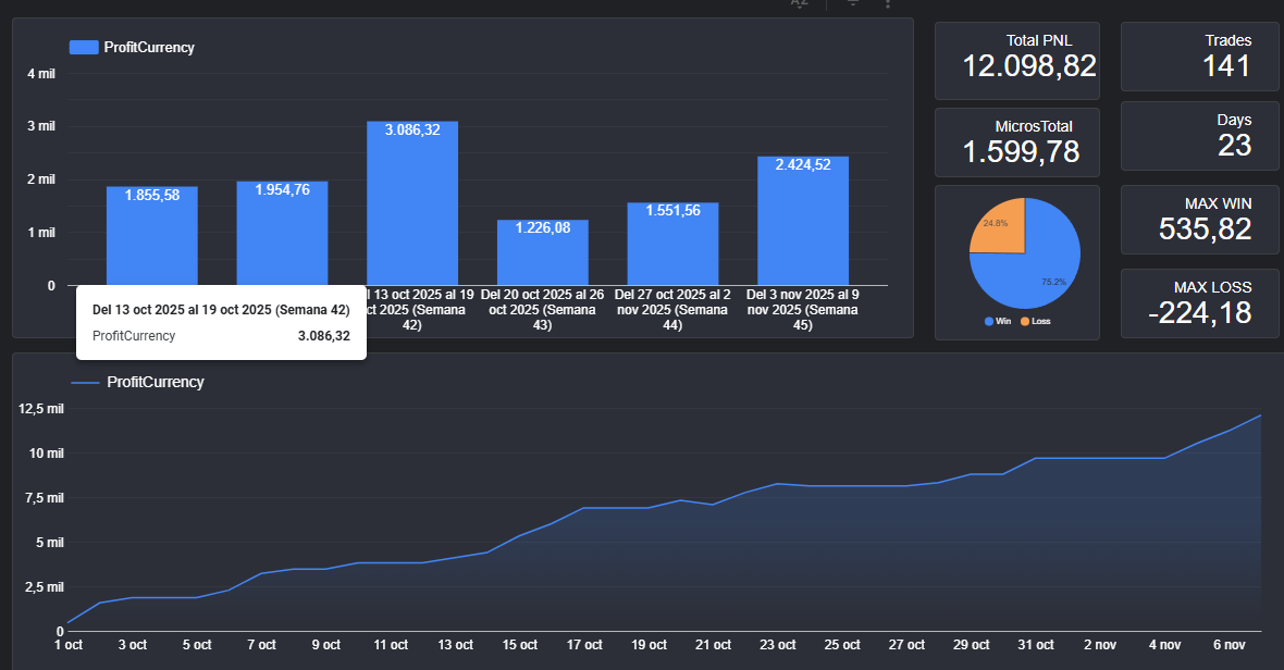 Dos trades hoy, hubo una fuerte tendendencia hacia el lado short, de esas dificiles de ignorar, sin embargo me mantuve paciente esperando a mi entrada, tuve una primera entrada que dio primer target y luego un par de entradas falsas donde no me deje engañar por el mercado, el final vi claramente la oportunidad de entrar y 2 targets, cerramos en viernes tambien con la prueba completada de los 1500 dolares en micros. Me siento bien.